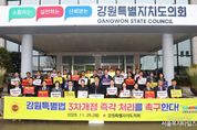 서울복지타임즈 이재연 기자 | 강원특별자치도의회는 25일 오후 1시 30분 도의회 본관 앞에서 ‘강원특별법 3차 개정안’의 조속한 국회 심사를 촉구하는 결의대회를 열었다. 이번 결의대회는 개정안이 발의된 이후 국회에서 심사조차 제대로 이뤄지지 않고 있는 상황에 대한 도민들의 인내 한계와 지역 균형발전에 대한 요구가 높아진 데 따른 것이다. 강원특별법 3차 개정안은 지난해 9월 한기호 의원과 송기헌 의원이 공동 발의했으나 현재까지 단 한 차례도 행안위 법안심사소위가 개최되지 않는 등 심사 지연이 장기화되고 있는 것으로 알려졌다. 정기국회 종료가 임박한 상황에서 이번 회기 내 법안 처리를 위한 시급성도 부각되고 있다. 이날 결의대회에는 국회 앞에서 릴레이 1인 시위를 이어가고 있는 박윤미 부의장과 이한영 운영위원장을 제외한 전 도의원이 참석했다. 문관현 기획행정위원장이 낭독한 결의문에는 ▲ 강원특별법 3차 개정안의 즉각 처리 요구 ▲ 개정안이 통과될 때까지 끝까지 투쟁하겠다는 결의 ▲ 300만 강원도민의 생존권 수호하겠다는 의지가 담겼다. 도의회는 결의대회 직후 결의문을 국회에