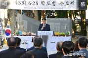 서울복지타임즈 이재연 기자 | 진주시는 27일 경상국립대학교 칠암캠퍼스의 ‘6·25참전 학도병 명비’ 앞에서 ‘제3회 6·25참전 학도병 추모제’를 거행했다. 이번 추모제는 6·25전쟁 당시 어린 나이에 전쟁터에서 산화한 학도병들의 넋을 위로하고 그들의 숭고한 희생정신을 기리기 위해 마련됐다. 진주에서는 6·25전쟁 당시 진주농림고등학교(現 경상국립대), 진주고등학교, 진주사범학교(現 진주교육대)의 학생 152명이 학도병으로 참전했으며, 당시 참전 학도병 중에 현재까지 생존자는 10여 명으로, 생존자들의 연령이 90세가 넘은 상태이다. 이날 행사는 차석호 진주시 부시장과 보훈 단체장, 유가족, 학생 등 100여 명이 참석한 가운데 묵념과 헌화, 분향, 추모사, 추모헌시 낭독 등의 순으로 진행됐다. 차석호 진주시 부시장은 “펜 대신 총을 들고 군번과 계급도 없이 부모 형제와 교정을 떠나 전쟁터로 향했던 그들의 숭고한 희생과 애국정신을 가슴 깊이 새기겠다”면서 “앞으로 학도병과 유가족이 자긍심을 갖고 살아갈 수 있도록 예우에 최선을 다하겠다”고 말했다.