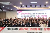 서울복지타임즈 이재연 기자 | 강원특별자치도 범국민추진협의회(협의회장 최양희, 추진단장 김천수)가 11월 21일 11시, 춘천 스카이컨벤션 2층 컨벤션홀에서 강원특별법 3차개정 조속 통과 촉구 결의대회를 개최했다. 당초 정기총회를 개최할 예정이었으나 어제(11월 20일) 국회 행정안전위원회 법안소위에서 강원특별법 3차 개정이 논의가 불발되자 긴급 행동에 나섰다. 이날 결의대회에는 범추협 위원들을 비롯해 고문직을 맡고 있는 김진태 도지사, 김시성 도의회 의장 등 200여 명이 참석하여 조속 통과를 촉구하는 목소리를 높였다. 최양희 협의회장은 “오늘은 강원특별자치도의 성과를 함께 축하하는 날이 돼야 했지만, 어제 행안위에서 3차 개정을 또 미루는 바람에 오히려 우리의 결의를 더 크게 보여줘야 하는 날이 됐다”라며, “각 지역에서 올라오신 위원 여러분의 지혜와 네트워크가 어느 때보다 절실하다”라고 말했다. 김진태 강원특별자치도지사는 “3차 개정안이 처음 국회에 올라간 게 작년 9월인데, 1년이 넘도록 단 한 번도 심사를 하지 않았다”라며, “5극 3특을 강조하면서 특별자치도 법은 시간이 없다고 국회 심사가 미뤄