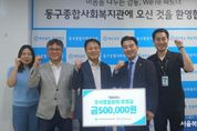 서울복지타임즈 이재연 기자 | 부산 동구, 동구종합사회복지관은 근로복지공단 부산지역본부에서 10월 1일 추석 명절을 앞두고, 동구 지역 소외계층에게 힘이 될 수 있도록 50만 원의 후원금을 동구종합사회복지관에 전달했다고 밝혔다. 해당 성금은 동구 지역 내 취약계층의 추석 명절맞이 지원으로 활용될 예정이다. 이외에도 근로복지공단 부산지역본부에서는 임직원들이 매주 수요일마다 복지관 4층 장난감도서관을 방문해 어린아이들이 안전하게 놀 수 있도록 장난감 소독 봉사활동에 꾸준히 참여하고 있다. 민병창 근로복지공단 부산지역본부장은 “어른, 아이 할 것 없이 모두가 행복하고 즐거운 동구가 될 수 있도록 앞으로도 다양한 활동을 통해 사회공헌사업을 이어나가겠다” 고 밝혔다.