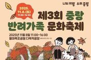 서울복지타임즈 이재연 기자 | 중랑구는 오는 11월 8일 토요일 오전 11시부터 용마폭포공원 다목적 광장에서 ‘제3회 중랑 반려가족 문화축제’를 개최한다. 중랑구가 주최하고 ㈜한국어질리티연합이 주관하는 이번 축제는 반려인과 비반려인 모두가 함께 즐기며 사람과 동물이 조화롭게 공존하는 문화를 조성하기 위해 마련됐다. 축제는 무대존, 플레이존, 부스존 등 3개 구역에서 다채로운 볼거리와 즐길 거리를 제공한다. 개회식은 오후 1시부터 류경기 중랑구청장 등 주요 내빈과 지역 주민 200여 명이 참석한 가운데 진행된다. 사전 공모된 ‘2025 중랑 유기동물 입양 사진·수기 공모전’ 시상식이 함께 열리며, 시상식 이후에는 반려견 능력시험과 더불어 행운권 추첨 등 다양한 프로그램이 진행돼 축제의 흥을 돋울 예정이다. 무대존에서는 중랑 K-댕댕이 헌터즈 펫션쇼와 같은 다양한 프로그램이 하루 종일 펼쳐진다. 플레이존은 반려 스포츠와 활동적인 체험 공간으로 구성된다. 펫티켓 5 미션게임, 어린이 훈련사 체험과 반려견 올림픽(기다려·이리와·찾아줘 대회)이 운영되며, 아시아 어질리티 챔피언십 한국 국가대표팀의 시범 공연