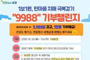 서울복지타임즈 이재연 기자 | 광주광역시 서구가 오는 20일부터 11월 6일까지 18일간, 치매 인식 개선과 기부문화 확산을 위한 ‘1보1원, 한마음 치매극복걷기 9988 기부챌린지’를 진행한다. 이번 챌린지는 치매상담콜센터 홍보와 함께 주민 참여를 통해 치매 극복에 대한 지역사회의 관심을 높이기 위해 기획됐다. 치매상담콜센터는 연중무휴로 전문상담사가 맞춤형 상담을 제공하는 서비스로 ‘18세 기억을 99세까지, 99세까지 팔팔(88)하게’라는 의미를 담고 있다. 참가자는 ‘워크온(Walk On)’ 앱을 활용해 하루 평균 9988보를 달성할 경우 ‘1만원 기부권’을 받을 수 있으며 챌린지 종료 후 만족도 조사와 기부 동의 절차를 완료하면 기부권이 서구 관내 취약계층 치매환자 가구에 전달된다. 서구는 총 300명의 챌린지 달성자를 목표로 하며 누적 기부금 300만 원은 치매환자 30가구에 각 10만 원씩 전달할 예정이다. ‘9988 챌린지’ 참여가 어려운 주민은 하루 동안 1만보를 걷고 1만 원을 기부하는 ‘1보1원 순수기부’에 참여할 수 있다. 김이강 서구청장은 “치매는 개인