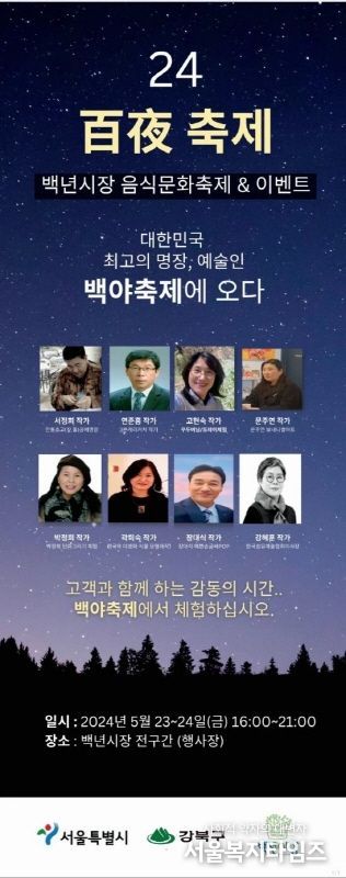 서울복지타임즈 이재연 기자 | 오는 5월 23일(목) 14:00~21:00, 서울 백년시장에서 야간음식문화축제인 ‘백야(百夜) 축제’가 개최된다. 이번 행사는 지난 2월 서울시에서 진행한 2024년 ‘야간음식문화축제 및 이벤트 지원 공모사업’에 선정된 사업이다. 백년시장은 오랫동안 야시장 개장을 준비해오던 상황에서 공모사업에 선정되어 행사를 추진하게 됐다.