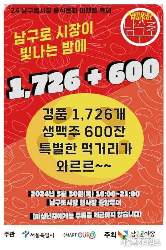 서울복지타임즈 이재연 기자 | 서울 남구로시장은 오는 5월 30일(목) 오후 4시부터 9시까지 음식문화이벤트축제(주관 서울시,구로구, 주최 남구로시장)를 개최한다고 전했다. 이번 음식문화축제에는 다양한 먹거리와 푸짐한 경품, 신나는 무대 공연이 펼쳐질 예정이다.