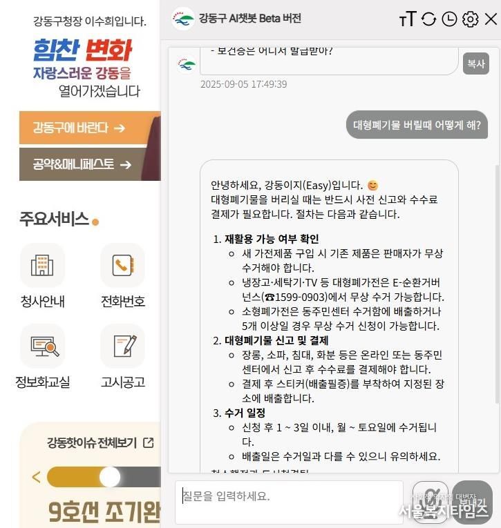 이번 챗봇 서비스는 대표 홈페이지 내의 보건소, 어린이회관, 도시관리공단, 문화재단, 통합도서관 등 총 6종의 생활 밀접 정보를 중심으로 제공한다. 주민은 ‘강동이지(EASY)’와 대화하듯 문의하면 필요한 정보를 손쉽게 확인할 수 있다. 이는 다른 자치구들이 개별 기관 단위로 제한된 AI 서비스를 시도하는 것과 달리, 강동구가 구 전반의 핵심 기관의 중요한 정보를 통합한 챗봇시스템을 구축했다는 점에서 한발 앞선 행보다.
