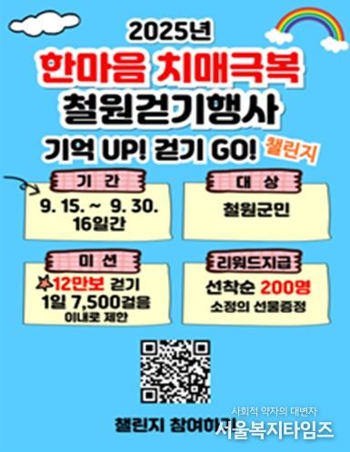 백승민 철원군보건소장은 “걷기처럼 작은 실천이 치매 예방의 큰 힘이 되듯, 이번 치매극복주간을 맞아 지역주민들이 치매에 대한 올바른 인식을 갖고 적극적으로 참여해 주시길 바란다” 고 전했다.