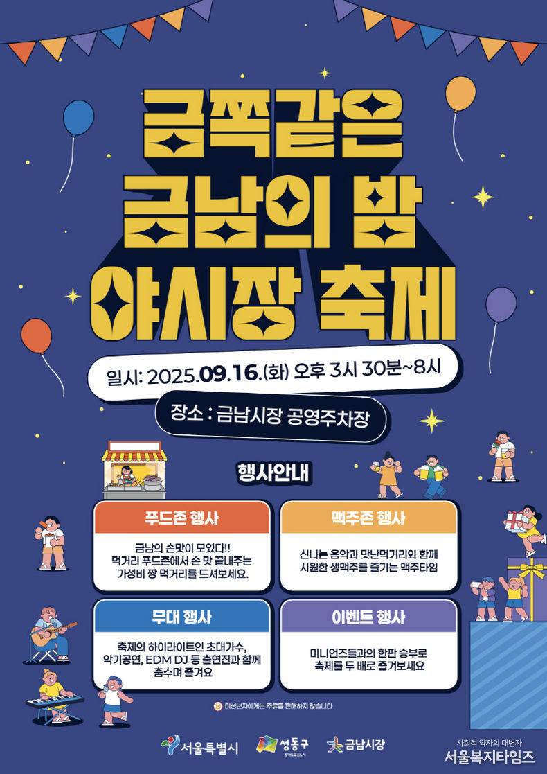 서울복지타임즈 이재연 기자 | 서울 성동구 금남시장이 2025년 9월 16일(화) 오후 3시 30분부터 8시까지 특별한 가을밤 축제의 장으로 변신한다.
