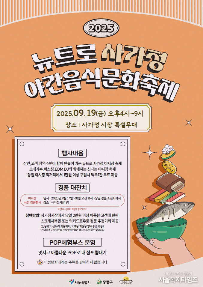 서울복지타임즈 이재연 기자 | 서울 중랑구의 대표 전통시장인 사가정시장이 9월 19일(목) 오후 4시부터 9시까지 ‘뉴트로 사가정 야간음식문화축제’를 개최한다. 이번 축제는 사가정시장이 주최하고 서울시와 중랑구청이 후원하며 (주)시장통이 수행기관으로 참여한다.
