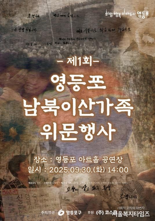 공연은 9월 30일 오후 2시 영등포 아트홀에서 열린다. 남북 이산가족과 후손, 지역 주민 등 누구나 사전 예약 없이 당일 현장 방문으로 관람할 수 있으며, 선착순 500석이 마련돼 있다. 자세한 사항은 구청 자치행정과로 문의하면 된다.