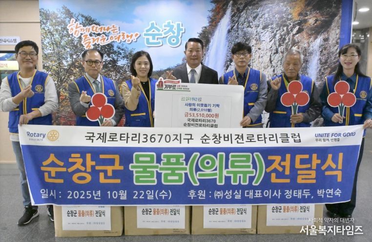 서울복지타임즈 이재연 기자 | 국제로타리 3670지구 순창비전로타리클럽(회장 김광진)은 유·아동 및 성인 내의류 전문 생산업체인 ㈜성실로부터 총 2,010벌(시가 약 5,300만 원 상당)의 의류를 후원받아 순창군청에 기탁했다.
