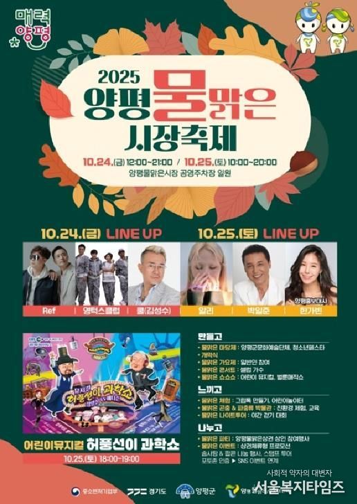 서울복지타임즈 이재연 기자 | 양평물맑은시장의 대표 축제인 ‘2025 양평물맑은시장 축제’가 오는 10월 24일부터 25일까지 양평물맑은시장 공영주차장에서 열린다.