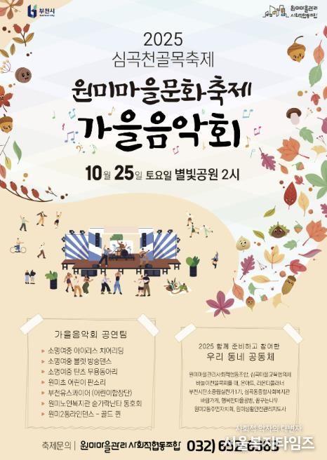 서울복지타임즈 이재연 기자 | 부천시는 10월 25일 원미별마루와 별빛공원 일대(부천로 90번길 51)에서 ‘2025년 심곡천 골목축제–원미마을문화축제 가을 음악회’를 연다. 이번 행사는 부천시 원도심재생과가 주최하고, 원미마을관리사회적협동조합이 주관한다.