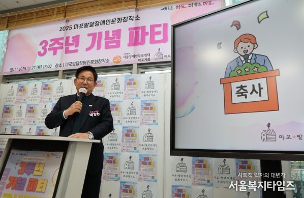 서울복지타임즈 이재연 기자 | 박강수 마포구청장은 11월 27일 오후 4시, ‘마포 발달장애인 문화창작소(양화로 178-5)’ 개관 3주년 기념 파티에 참석해 이용인·가족·운영 관계자들과 따뜻한 축하의 시간을 가졌다.