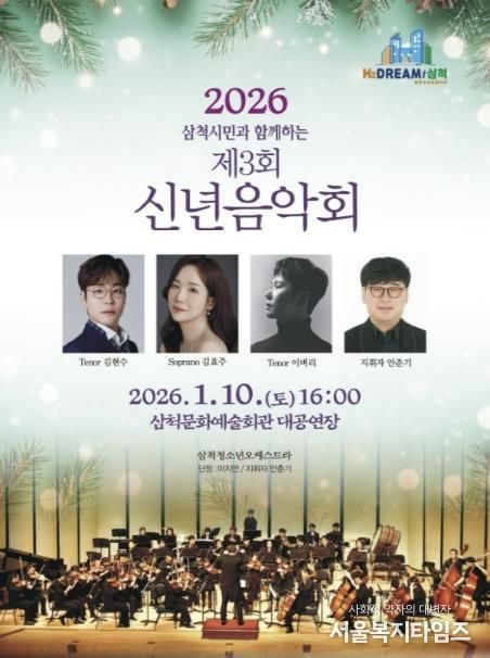 서울복지타임즈 이재연 기자 | 삼척시는 새해를 맞아 시민과 함께 문화로 희망을 나누는 '2026 삼척시민과 함께하는 제3회 신년음악회'를 오는 1월 10일 오후 4시, 삼척문화예술회관 대공연장에서 개최한다.