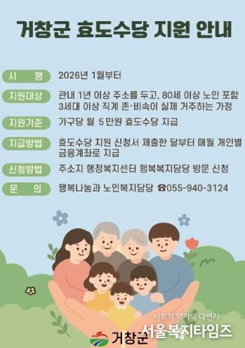 서울복지타임즈 이재연 기자 | 거창군은 경로효친의 건전한 가족제도 정착과 효 문화 확산을 위해 효도수당 지원 대상을 확대하고, 2026년 1월부터 본격 지급에 나선다.