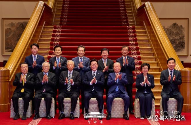 서울복지타임즈 이재연 기자 | 이재명 대통령은 오늘 청와대 본관에서 1시간 45분 동안 민주당 상임고문 열 분과 오찬 간담회를 가졌다. 참석자는 권노갑 고문과 김원기·임채정·문희상·김진표·정세균·박병석 전 국회의장, 한명숙 전 총리, 정동영 통일부 장관, 이용득 고문이다.