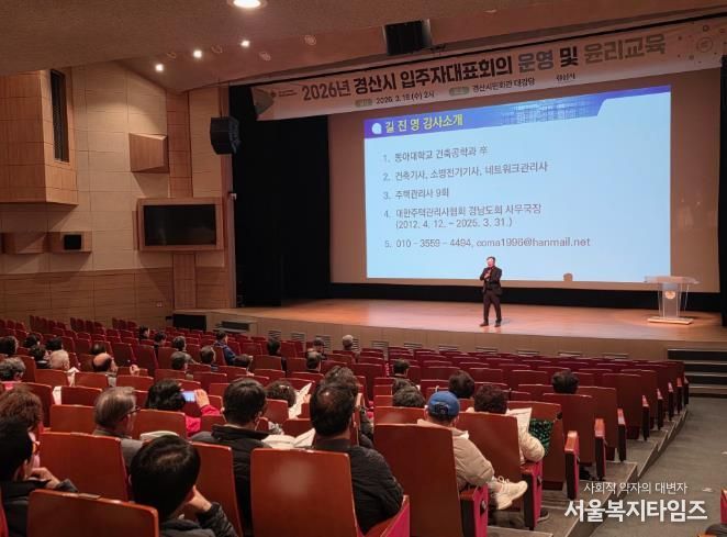 서울복지타임즈 이재연 기자 | 경산시는 18일, 경산시민회관 대강당에서 공동주택 관리 분야 입주자대표회의 운영 및 방범·소방 교육을 공동주택 관리 종사자 및 입주자 대표들을 대상으로 집합교육을 실시했다.