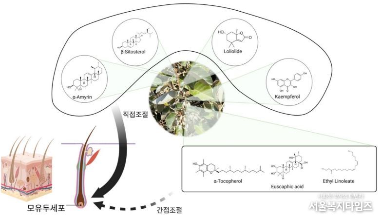 연구진은 보리밥나무 가지 추출물을 분석한 결과, 모유두세포의 증식과 활성화에 직접적인 효과를 보이는 4가지 핵심 천연성분을 확인했다. 해당 성분은 β-sitosterol(강화 140%, 증식 117%), α-amyrin(증식 148%), loliolide(강화 112%), kaempferol(강화 182%)로 세포 실험 결과, 인체 모유두세포를 직접적으로 자극하는 효과를 보였다.