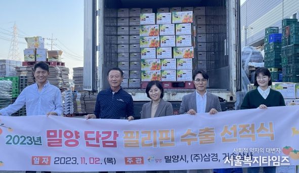 서울복지타임즈 이득형 기자 | 밀양시는 상남면 소재 농업회사법인 삼경에서 수출 농가, 수출업체 등이 참여한 가운데 2023년산 밀양 단감 첫 수출을 기념하는 선적식을 했다고 3일 밝혔다.