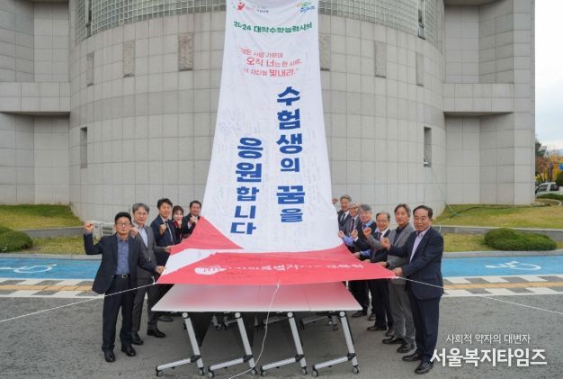 수능 수험생들을 위한 응원과 격려의 글이 가득한 대형 펼침막은 3일부터 수능을 치르는 16일까지 청사 외벽에 게시된다.