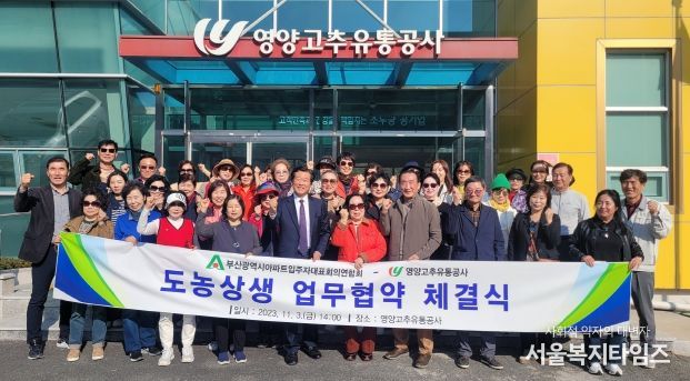 서울복지타임즈 이득형 기자 | 영양고추유통공사는 11월 3일 (사)전국아파트입주자대표회의연합회 부산시지회와 영양고추유통공사에서 도농상생 업무협약을 체결했다. 이날 부산시지부에서는 지부장과 40여 명이, 영양고추유통공사 관계자 등 20여 명이 참석했다.