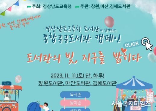 서울복지타임즈 이득형 기자 | 경상남도교육청은 11월 11일 창원도서관, 마산도서관, 김해도서관에서 ‘도서관의 빛, 지구를 밝히다’라는 주제로 경남교육청 통합공공도서관 캠페인을 연다.
