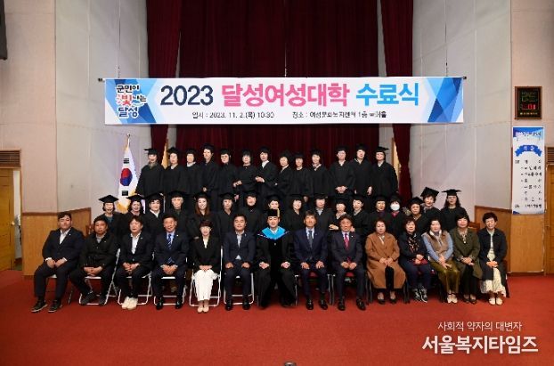 서울복지타임즈 이득형 기자 | 대구 달성군은 지난 2일 달성군여성문화복지센터 강당에서 관내 기관 단체장, 역대 여성대학 임원과 350여명의 수료생이 참석한 가운데‘2023년 달성여성대학 수료식’을 가졌다.