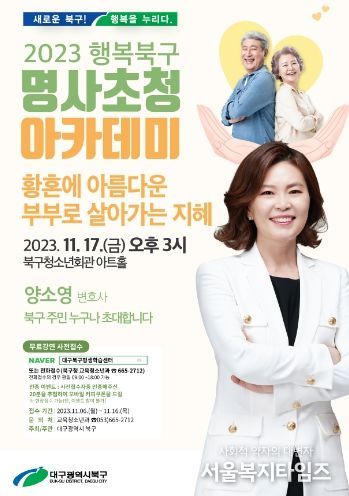 서울복지타임즈 이득형 기자 | 대구 북구청은 11월 17일 오후 3시, 북구청소년회관 아트홀에서'2023 행복북구 명사초청 아카데미'11월 강연을 개최한다.