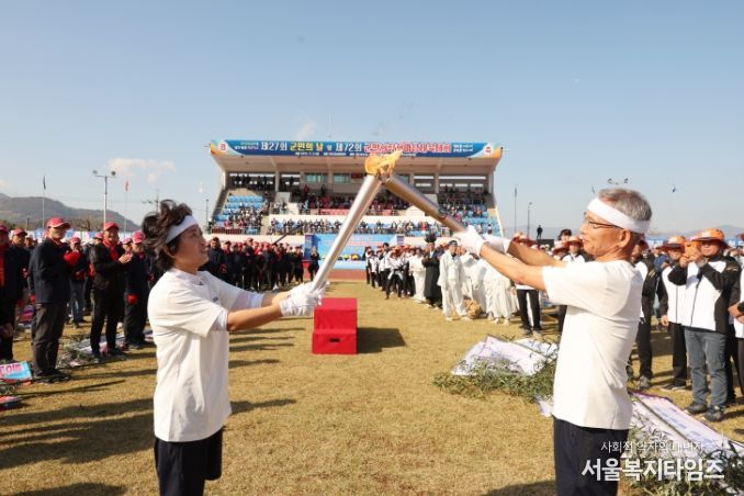 이어서 체육행사의 빠질 수 없는 묘미인 성화 점화 행사에는 다양한 분야에서 활동하는 각계각층의 주자들이 참여했고, 성화 점화의 순간 불꽃과 함께 전광판에서 군정 홍보영상이 흘러나오며 올해 새롭게 제작․설치된 성화대에 불이 올랐다.