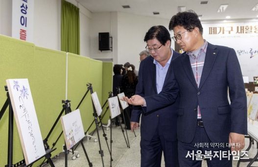 이날 성과보고회에는 자원봉사자들의 재능기부로 싱크대 자투리 나무를 활용해 만든 액자에 그림과 캘리그라피 등 작품 60여점이 전시됐다. 전시된 작품들은 지역 경로당 어르신들에게 전달할 예정이다.
