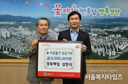 서울복지타임즈 이득형 기자 | 심한식 경북매일신문 기자가 3일 경산시청을 방문해 경산지역 저소득층을 위해 사용해 달라며 작년에 이어 이웃돕기 성금 2백만원을 기탁했다.