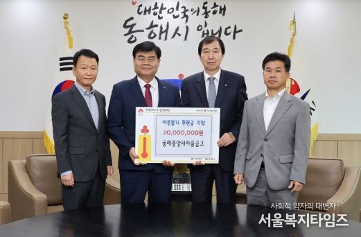 심규언 시장은 “청소년들이 안정적인 환경에서 공부할 수 있는 여건을 조성하고, 복지사각지대에 있는 위기가구가 따뜻한 겨울을 보내는데 지속적으로 도움을 주신 동해중앙새마을금고 정영교 이사장 및 임직원들에게 감사드린다.”라며,