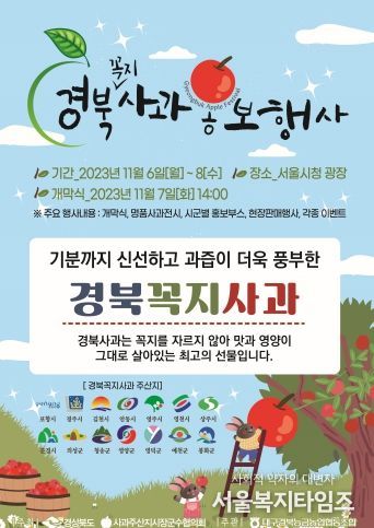 서울복지타임즈 이득형 기자 | 경북도는 서울, 수도권 등 대도시 소비자를 대상으로 최고의 맛과 품질을 자랑하는 경북 사과의 우수성을 알리고자 11월 6~8일까지 3일간 서울시청 광장에서 '2023 경북사과 홍보행사'를 개최한다.