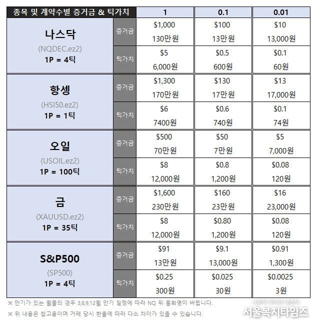 EZ 스퀘어는 불법 대여업체가 아닌 정식 해외선물거래소로 만기일이 없는 연속 선물 또한 지원하며 국내 증권사 대비 현저히 낮은 증거금으로 거래가 가능하기에 부담없이 해외선물에 투자하시고 매매할 수 있다.