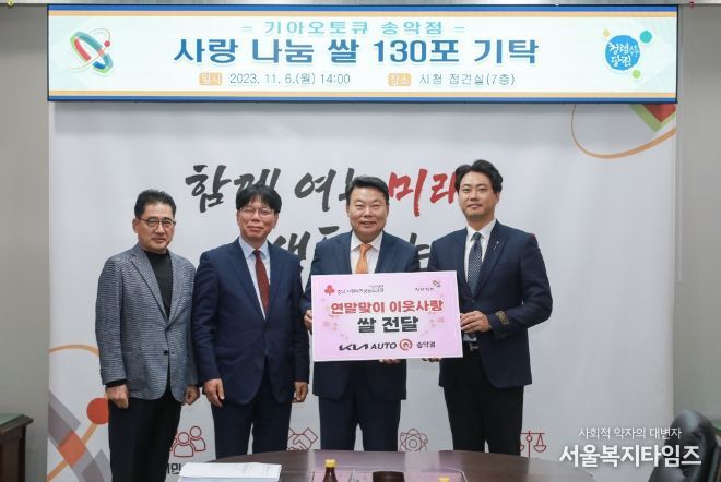 서울복지타임즈 이득형 기자 | 기아오토큐(주) 송악점은 6일 시청을 방문해 쌀 130포대(430만 원 상당)를 전달했다.