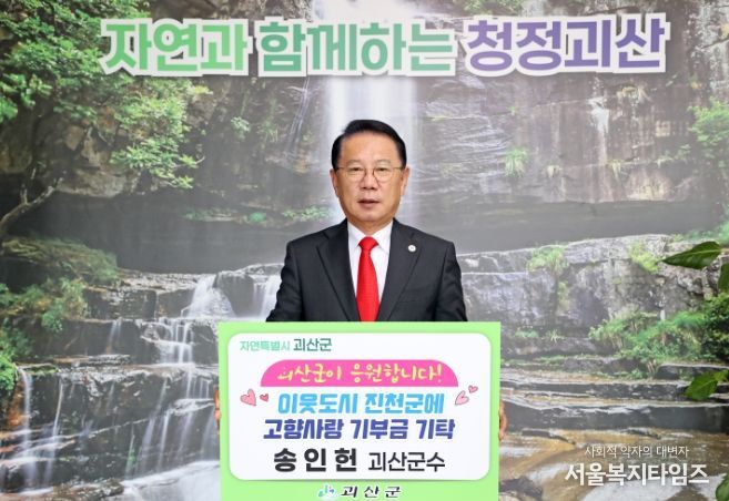 서울복지타임즈 이득형 기자 | 송인헌 괴산군수는 지난 6일 이웃도시인 진천군에 고향사랑기부금 100만 원을 전달했다.