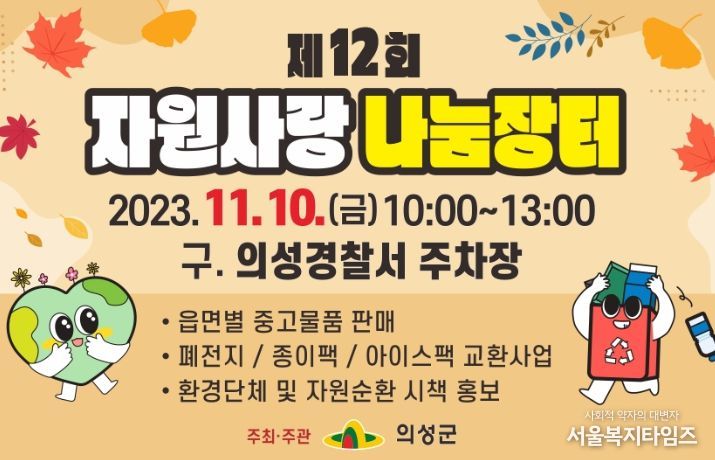 서울복지타임즈 이득형 기자 | 의성군은 ‘제12회 자원사랑 나눔장터’가 10일 오전 10시부터 오후 1시까지 옛 의성경찰서 부지에서 열린다고 밝혔다.