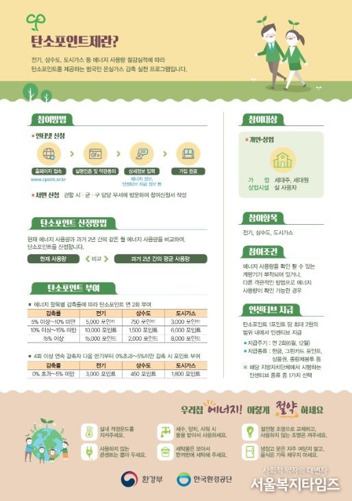 지급 대상은 탄소중립포인트제 가입가구 중 전기‧상수도‧도시가스 등의 에너지 항목 중 1가지 이상이 5% 이상 절감한 가정으로, 각 에너지 사용 감축률에 따라 차등 지급할 예정이다.