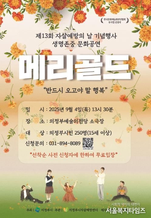 서울복지타임즈 이재연 기자 | 의정부시자살예방센터는 9월 4일 의정부예술의전당 소극장에서 ‘세계 자살예방의 날’ 기념행사로 창작 뮤지컬 ‘메리골드’를 선보인다.