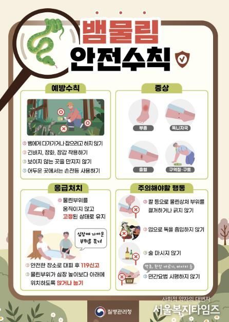 전진선 양평군수는 “벌 쏘임이나 뱀 물림 사고는 초기 대응이 매우 중요하다”며 “군민들께서는 야외 활동 시 긴 소매 옷과 장화를 착용하고, 벌집이나 뱀의 서식처로 의심되는 지역은 가급적 피하는 것이 좋다”고 당부했다.
