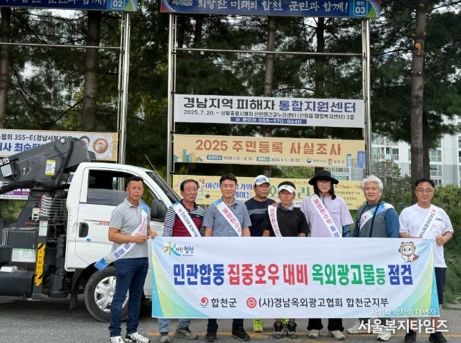 서울복지타임즈 이재연 기자 | 합천군은 7일 여름철 집중호우로 인한 안전사고를 예방하고 쾌적한 도시환경을 조성하기 위해 옥외광고물 안전점검을 실시했다.