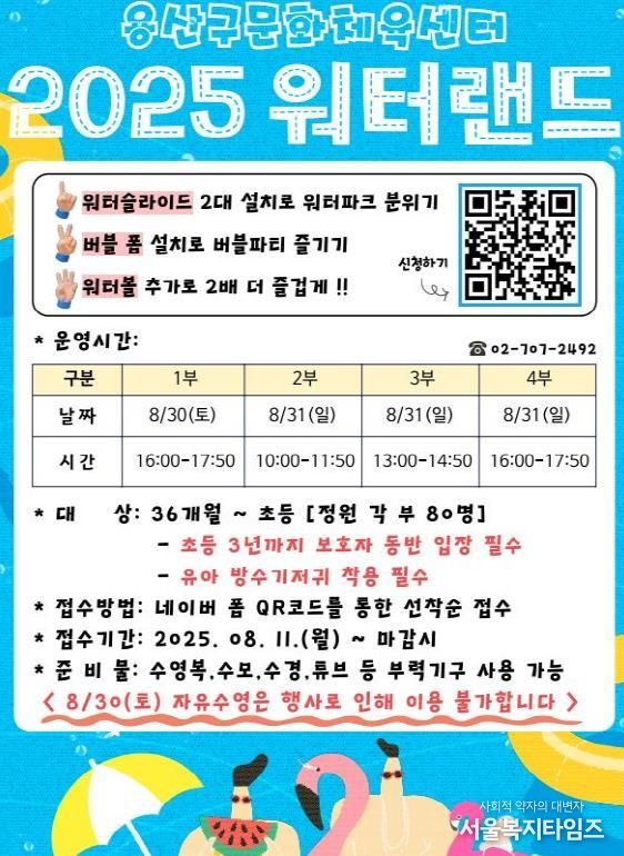 서울복지타임즈 이재연 기자 | 서울 용산구는 ‘약자와의 동행’ 일환으로 오는 8월 30일부터 31일까지 이틀간 용산구문화체육센터(백범로 350) 수영장에서 '2025 워터랜드' 행사를 개최한다고 밝혔다.