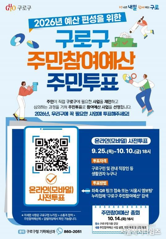 서울복지타임즈 이재연 기자 | 구로구가 오는 25일 오전 9시부터 10월 10일 오후 6시까지 ‘2026년 주민참여예산 사업’ 선정을 위한 온라인 투표(엠보팅)를 실시한다.