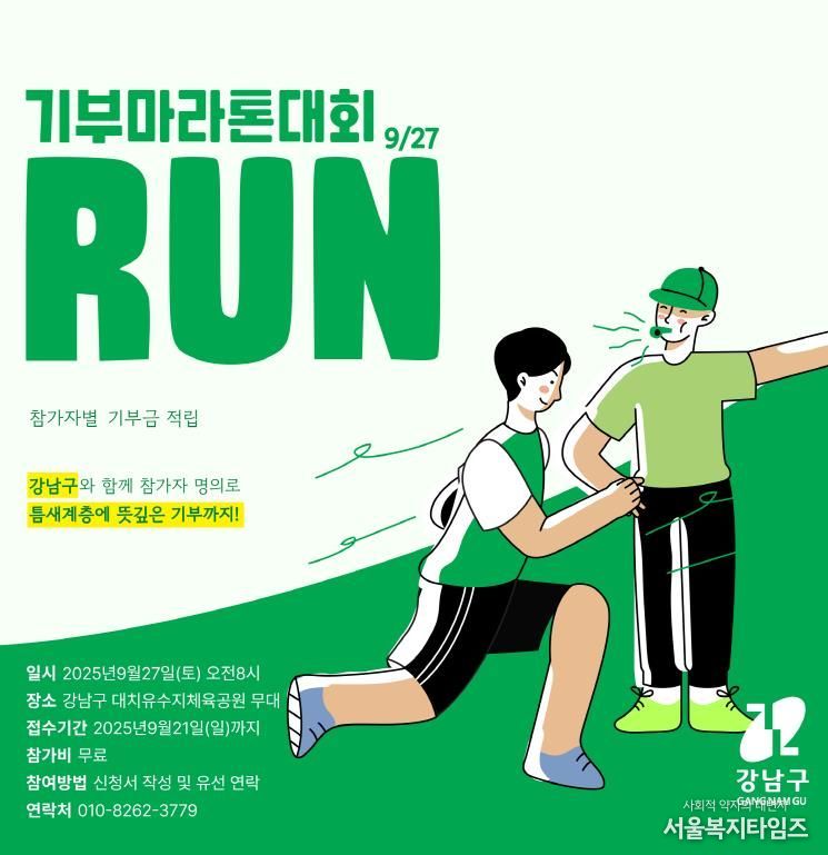 서울복지타임즈 이재연 기자 | 꿈이 모이는 도시, 미래를 그리는 강남구가 오는 9월 27일 오전 9시부터 오후 2시 30분까지 양재천 일대에서 ‘기부-Run 강남 달리기’ 행사를 개최한다. 이 행사는 참가자의 걸음과 달리기가 기부로 이어지는 기부 연계형 건강 캠페인으로, 건강한 나눔을 실천하는 지역사회 공헌 프로그램이다.