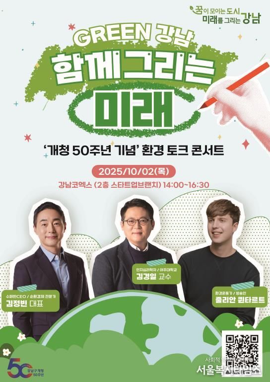 조성명 강남구청장은 “이번 환경 토크 콘서트는 강남 50년의 성장을 돌아보는 동시에, 미래세대를 위한 지속가능한 도시에 대해 함께 고민하는 자리”라며 “앞으로도 주민, 기업, 전문가가 함께하는 협력 모델을 통해 탄소중립 도시 강남을 실현하고, 기후위기 대응을 선도하는 글로벌 도시로 나아가겠다”고 밝혔다.