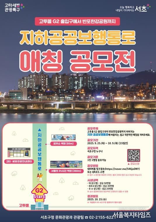 서울복지타임즈 이재연 기자 | 서울 서초구는 10월 9일까지 고터·세빛 관광특구 내 위치해 고투몰과 반포한강공원을 잇는 지하 공공보행통로 애칭 공모전을 개최한다고 밝혔다.