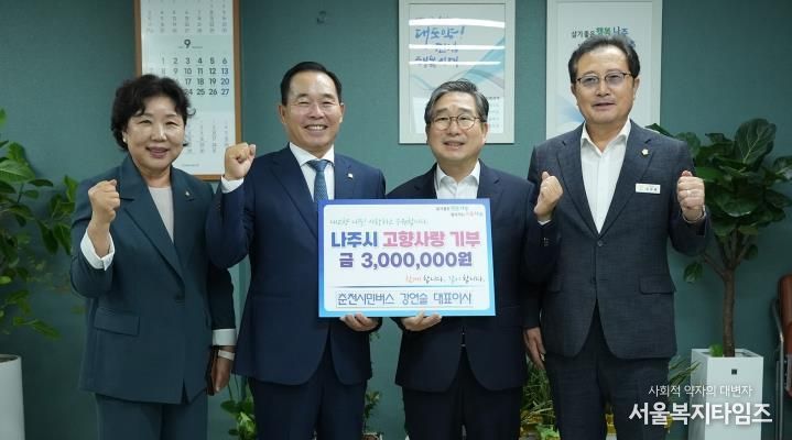 서울복지타임즈 이재연 기자 | 전라남도 나주시는 춘천시민버스 강연술 대표(왼쪽 두번째)가 지난 25일 지역사회 발전을 위해 고향사랑기부금 300만 원을 기탁했다고 밝혔다.