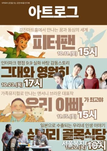 오는 10월 11일 ‘피터팬’을 시작으로 이어지는 ‘아트로그 가을 시즌’ 관람 신청은 강진군청 누리집 가입-소통과 참여-공연/행사 게시판에서 댓글로 참여할 수 있다.