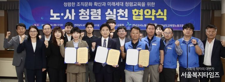 서울복지타임즈 이재연 기자 | 전라남도교육청은 30일 청사 비즈니스실에서 전남교사노동조합, 전라남도교육청노동조합과 ‘청렴 실천 협약(MOU)’을 맺고 청렴한 조직문화 확산과 미래세대 청렴교육 강화를 약속했다.