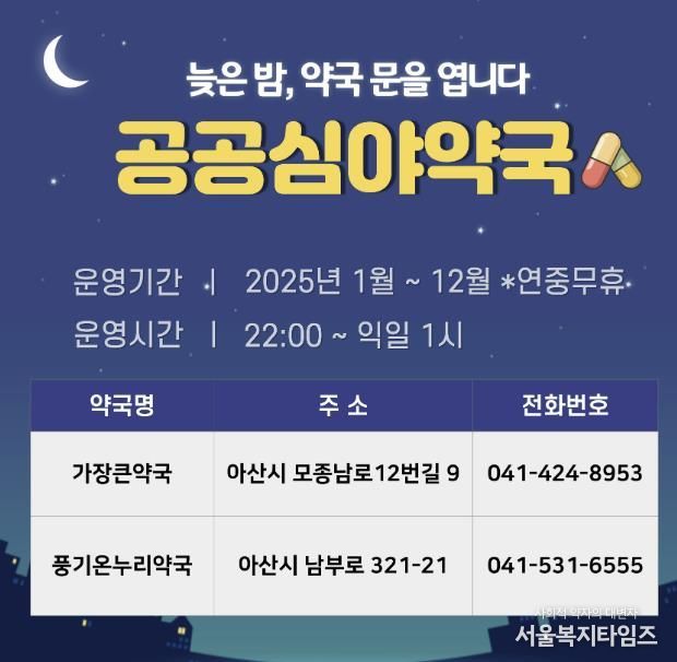 올해 지정된 공공심야약국은 △가장큰약국(아산시 모종남로12번길 9) △풍기온누리약국(아산시 남부로 321-21) 총 2개소로, 밤 10시부터 익일 오전 1시까지 운영된다. 또한, 주말과 공휴일, 명절에도 운영되어 언제든지 의약품 구매가 가능하다.